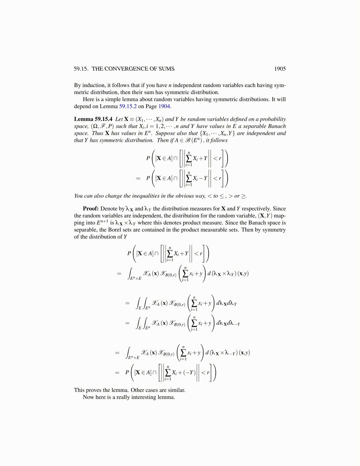 59.15 The Convergence Of SumsIt turns out that when random variables have symmetric distributions, some remarkablethings can be said about infinite sums of these random variables. Conditions are givenhere that enable one to conclude the convergence of the sequence of partial sums from theconvergence of some subsequence of partial sums.