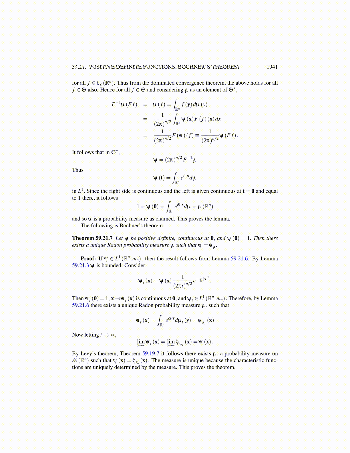 Lemma 59.21.6 Suppose ψ (t) is positive definite, t→ ψ (t) is in L1 (Rn,mn) where mnis Lebesgue measure, ψ (0) = 1, and ψ is continuous at 0. Then there exists a uniqueprobability measure, µ defined on the Borel sets of Rn such that
