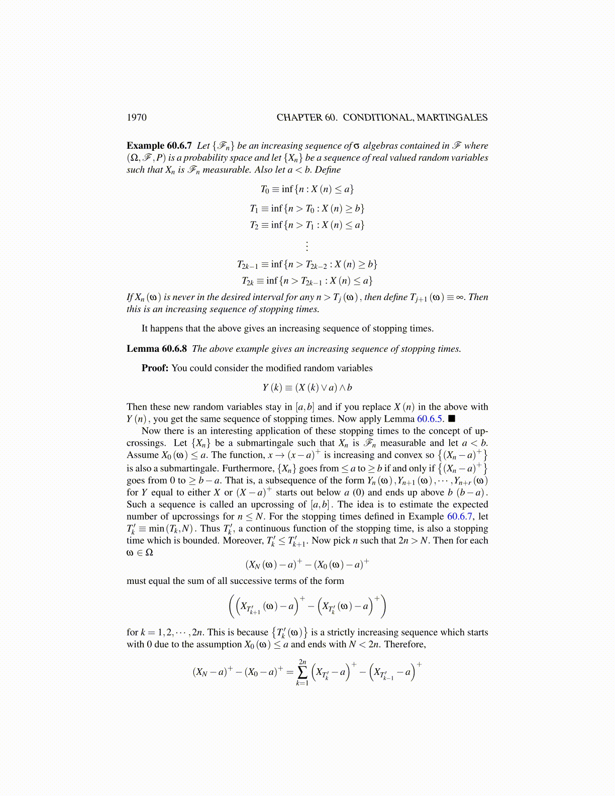 Next let T (ω) be the first time Xk (ω) is≤−λ or if this does not happen for k≤ n, thenT (ω)≡ n. Then this is a stopping time by similar reasoning and 1≤ T (ω)≤ n are stoppingtimes and so by the optional stopping theorem, X1,XT ,Xn is a submartingale. Therefore, on[