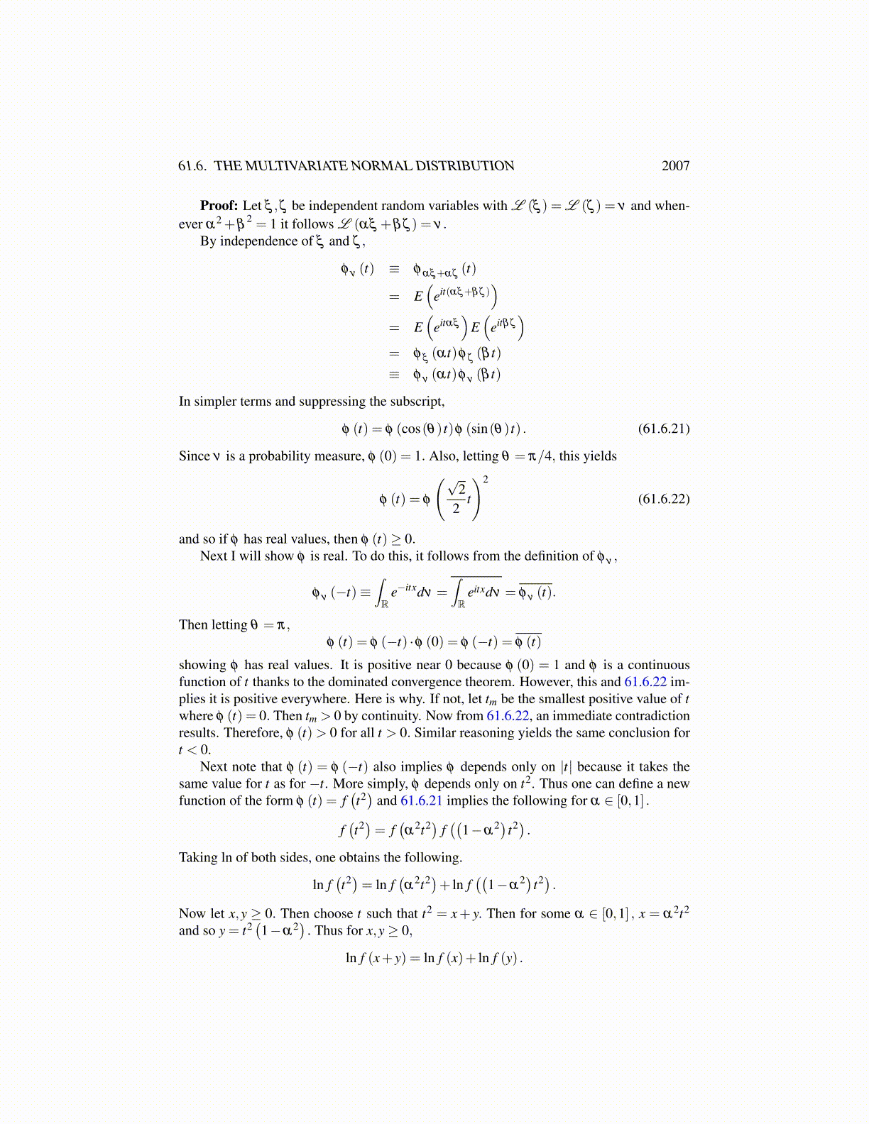 Theorem 61.6.4 Let X = (X1, · · · ,Xp) where each Xi is a real valued random variable.Then X is normally distributed in the above generalized sense if and only if every linearcombination, ∑