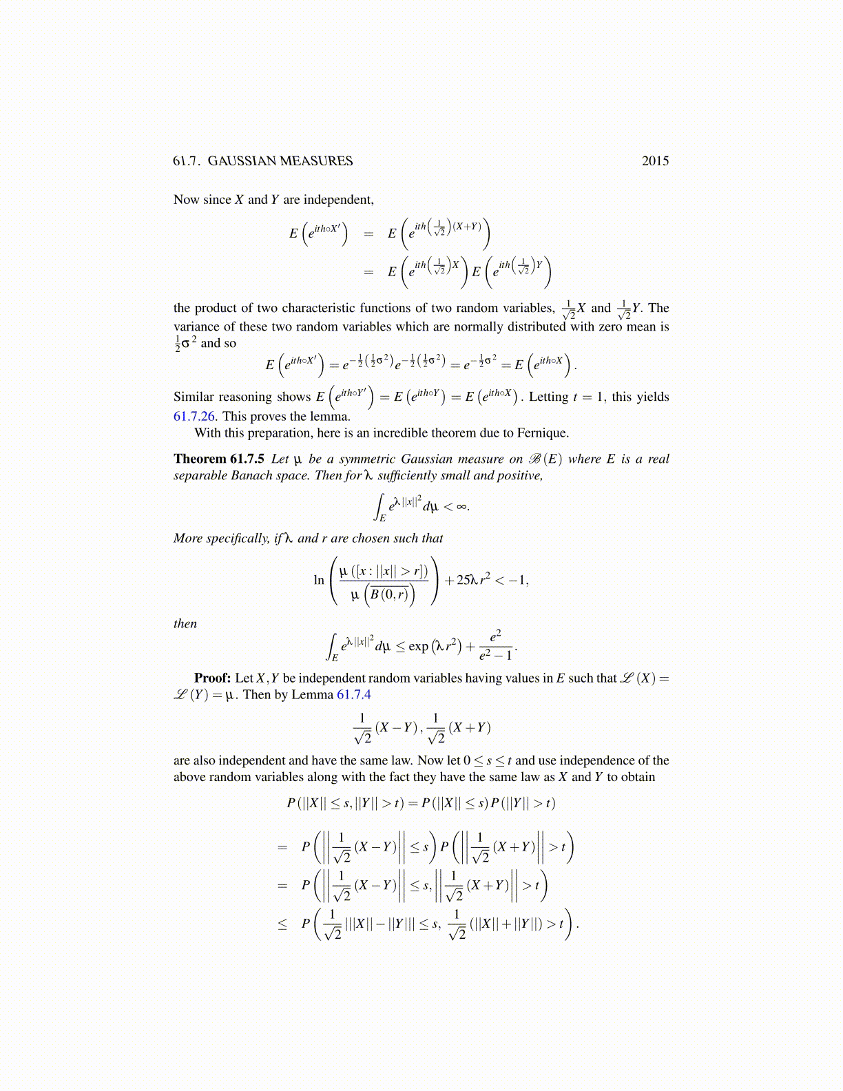 Lemma 61.7.4 Suppose µ is a symmetric Gaussian measure on the real separable Ba-nach space, E. Then there exists a probability space, (Ω,F ,P) and independent randomvariables, X and Y mapping Ω to E such that L (X) = L (Y ) = µ. Also, the two randomvariables,
