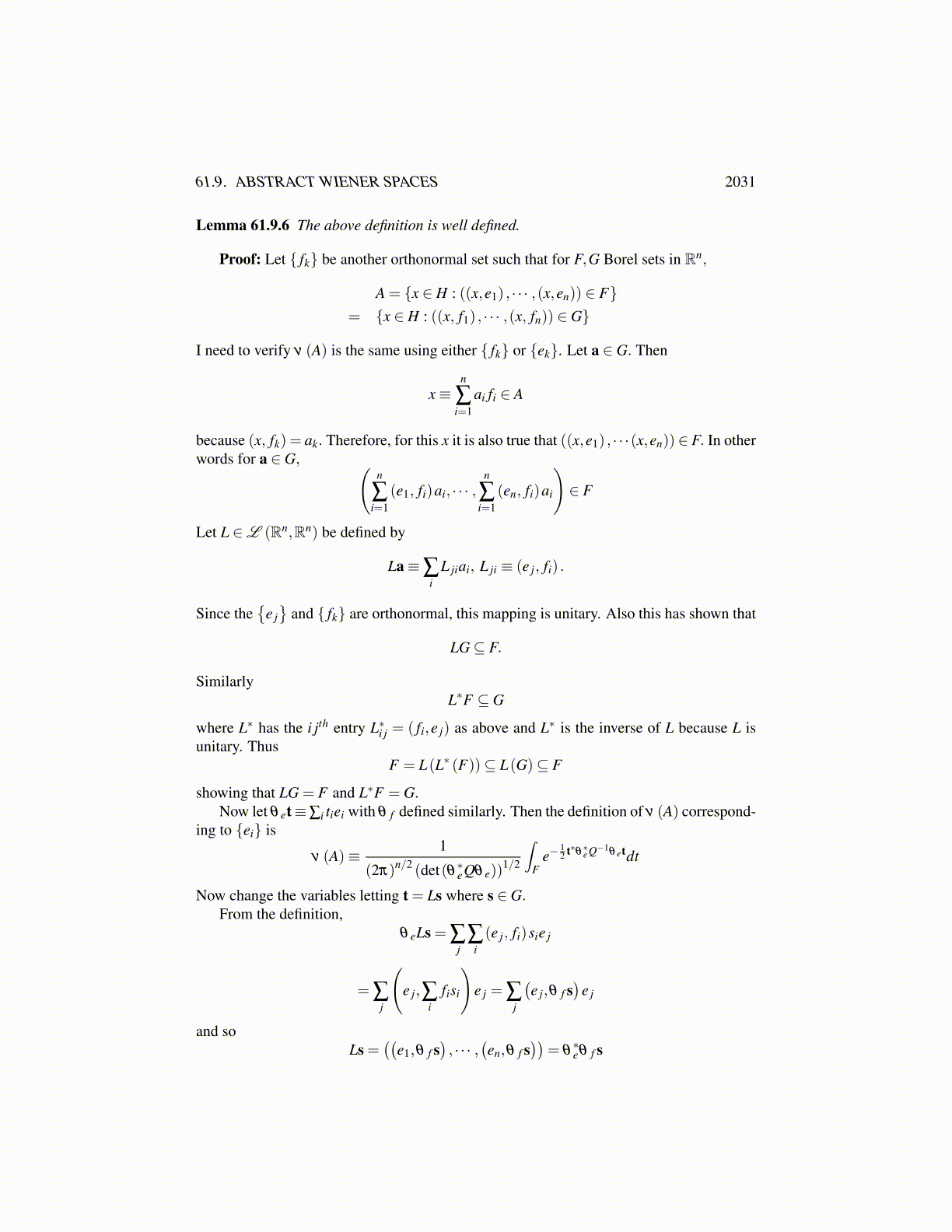 Proof: It follows from the definition of these cylinder sets that if fi (x) ≡ (x,ei) , sothat fi ∈ H ′, then with respect to σ (C ) , each fi is measurable. It follows that every linearcombination of the fi is also measurable with respect to σ (C ). However, this set of linear