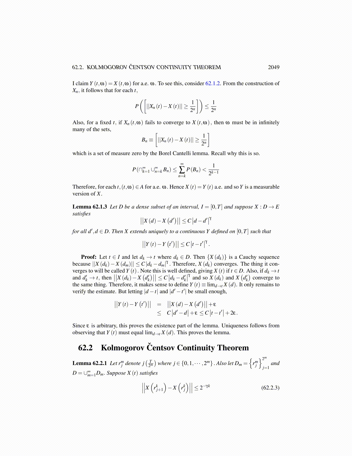 Here E will be a separable Banach space and B (E) will be the Borel sets of E. Let(Ω,F ,P) be a probability space and I will be an interval of R. A set of E valued randomvariables, one for each t ∈ I, {X (t) : t ∈ I} is called a stochastic process. Thus for each t,X (t) is a measurable function of ω ∈ Ω. Set X (t,ω) ≡ X (t)(ω) . Functions t → X (t,ω)are called trajectories. Thus there is a trajectory for each ω ∈Ω. A stochastic process, Y iscalled a version or a modification of a stochastic process, X if for all t ∈ I,