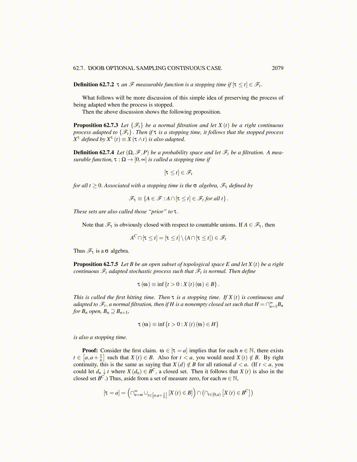 Theorem 62.6.7 Let {X (k)} be a real valued submartingale with respect to the increasingsequence of σ algebras, {Fk} and let σ ≤ τ be two stopping times such that τ is bounded.Then M (τ) defined as
