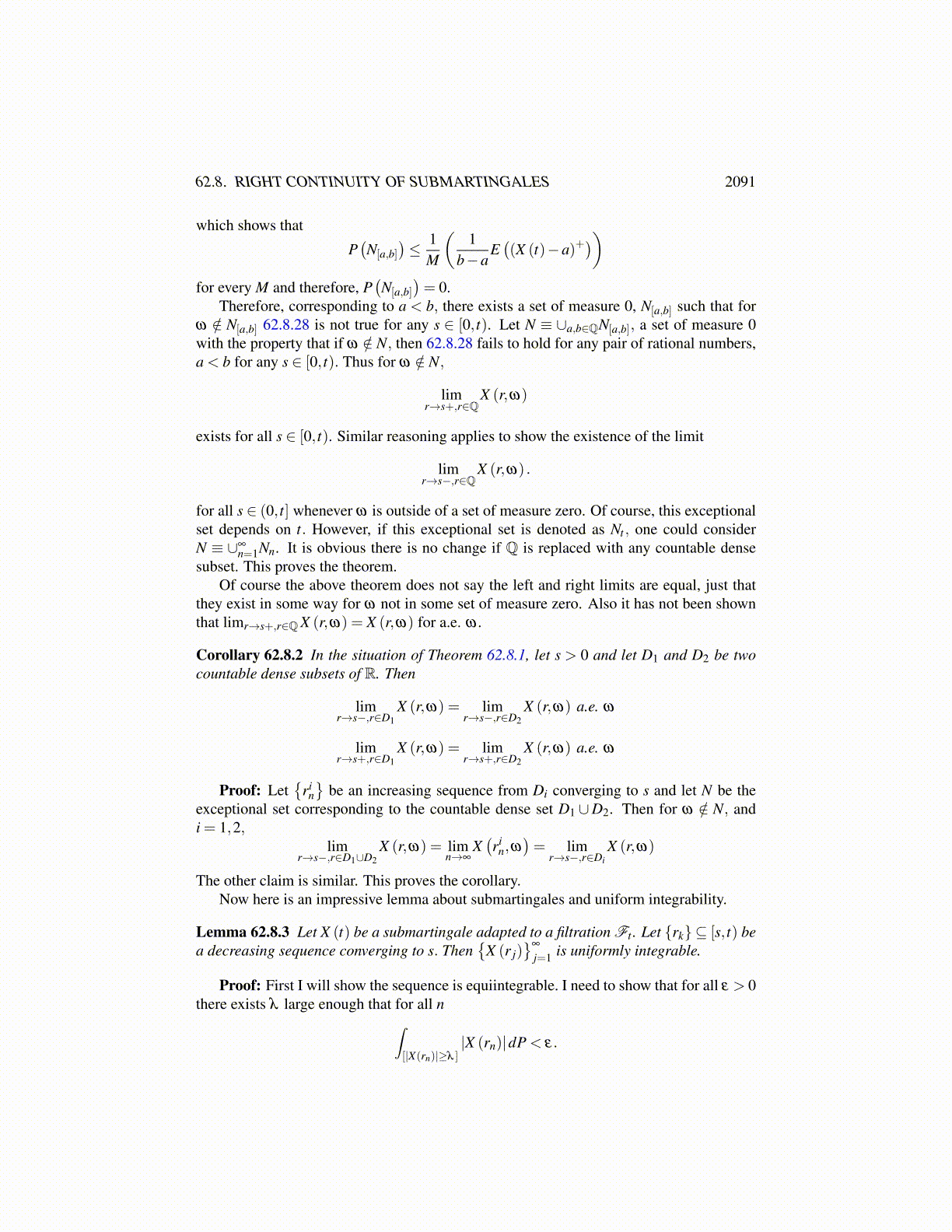 62.8 Right Continuity Of SubmartingalesThe following theorem is an attempt to consider the question of right continuity. It turnsout that you can always assume right continuity of a submartingale by going to a suitableversion and this theorem is a first step in this direction.