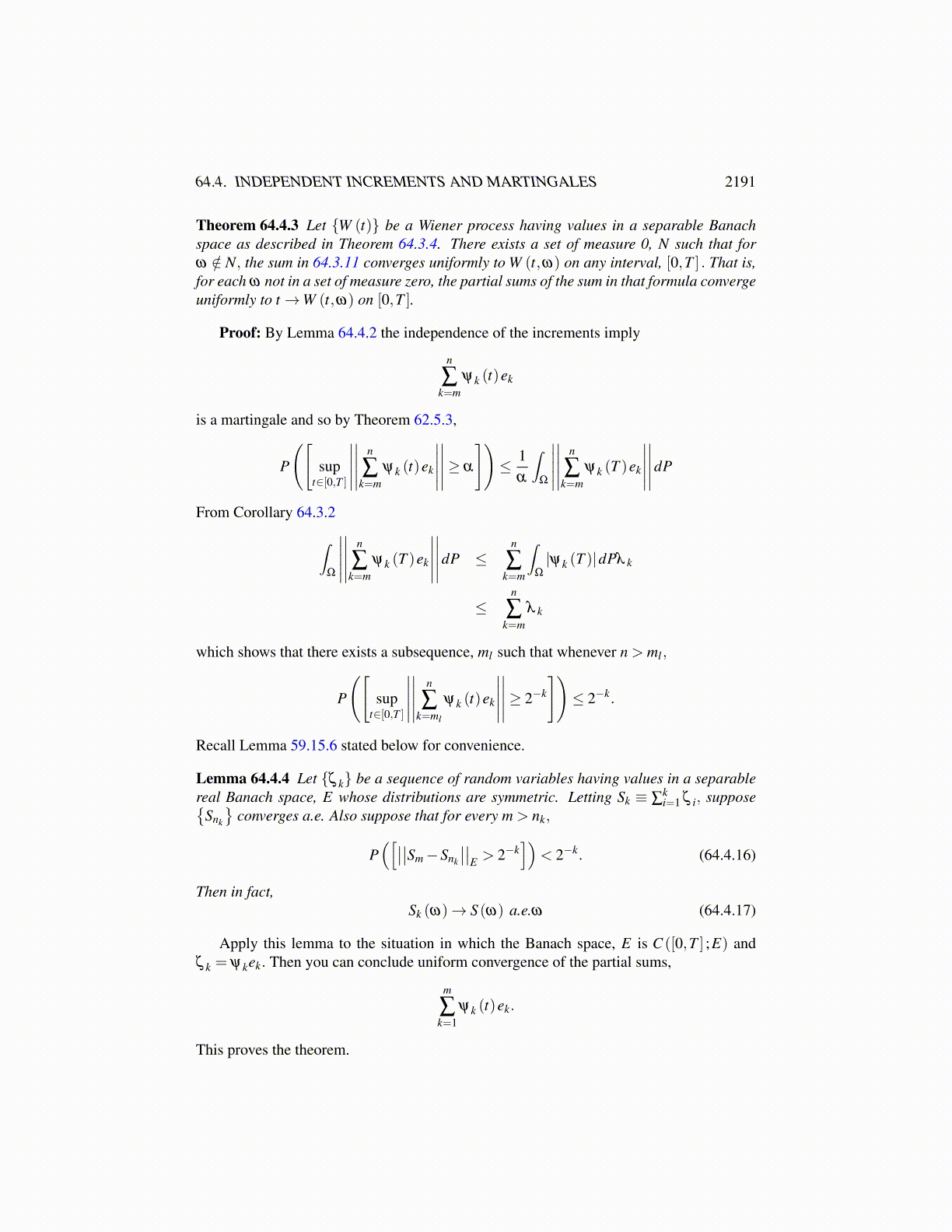 Lemma 64.4.2 Let {W (t)} be a stochastic process having values in a separable Banachspace which has the property that if t1 < t2 · · ·< tn, then the increments,