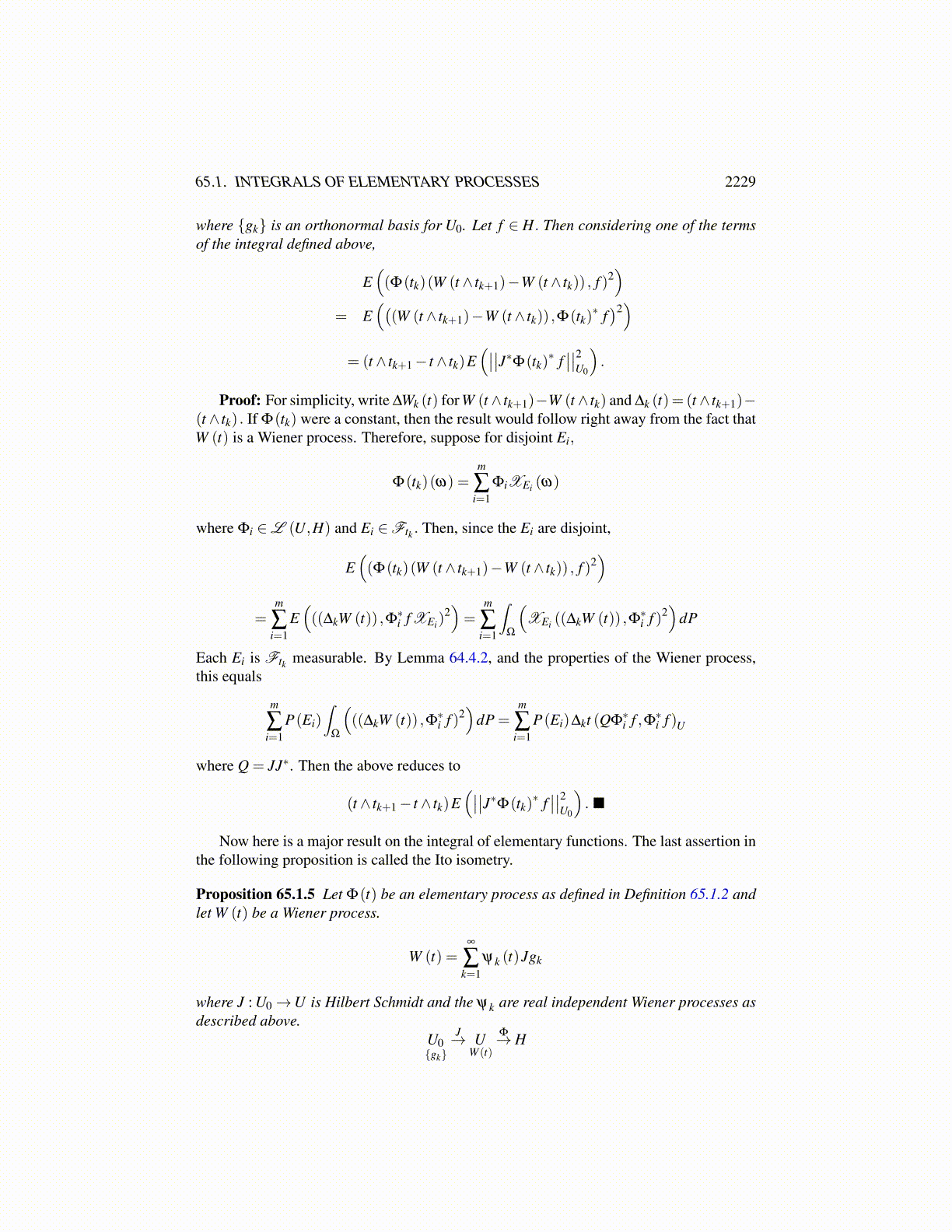 Definition 65.1.2 Let Φ(t)∈L (U,H) be constant on each interval, (tm, tm+1] determinedby a partition of [a,T ] , 0 ≤ a = t0 < t1 · · · < tn = T. Then Φ(t) is said to be elementary ifalso Φ(tm) is Ftm measurable and Φ(tm) equals a sum of the form