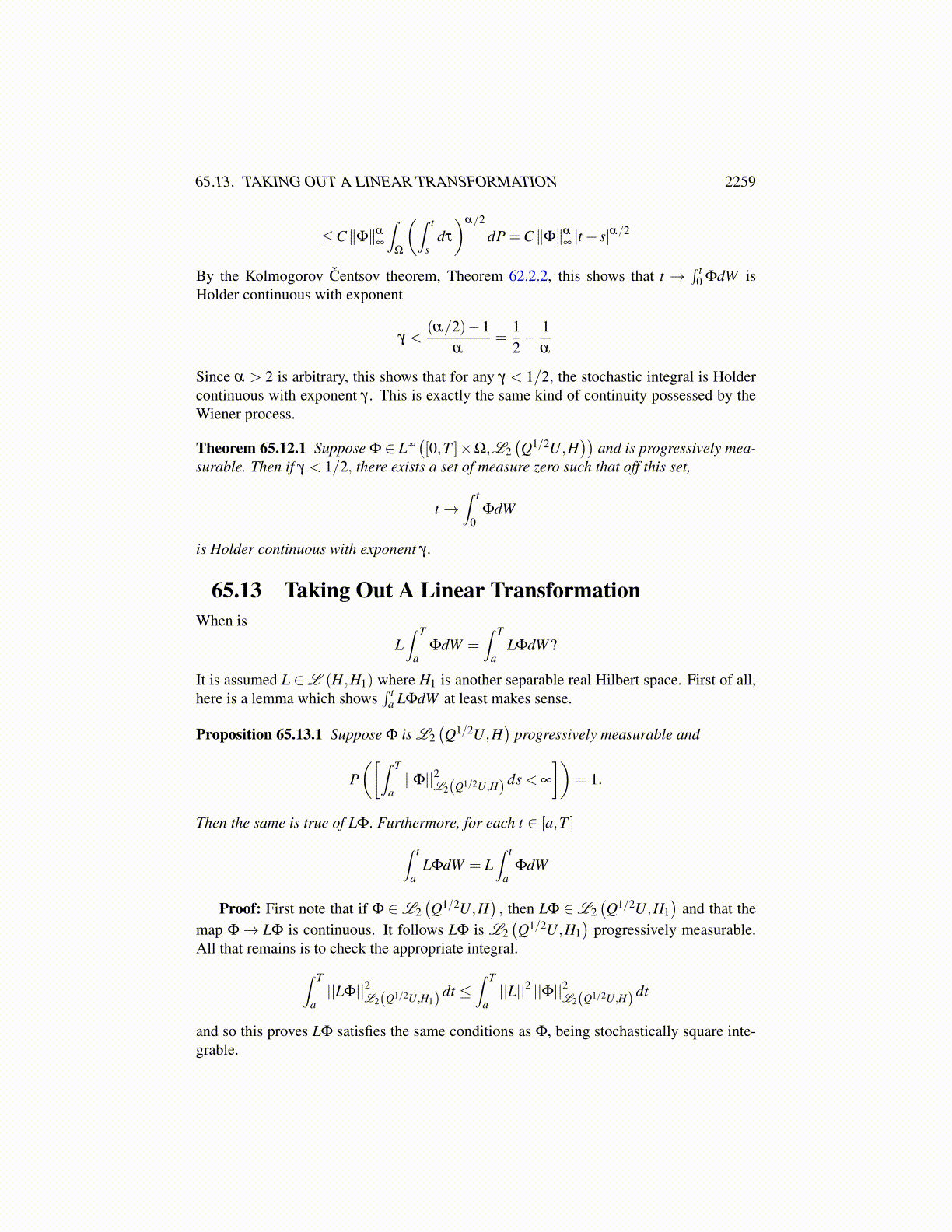 2 ds uniformly so τnp→ τ p is likely.However, this does not imply X[0,τnp]→X[0,τ p]. However, it would converge in L2 (0,T )and so there is a subsequence such that convergence takes place a.e. t. Then restrictingto this subsequence, the second integral converges to 0. Actually, it may be easier thanthis. X[0,τ p] has a single point of discontinuity and convergence takes place at every otherpoint. Thus it appears that the integrand in 65.11.19 converges to 0 for each ω . Thus, bydominated convergence theorem the whole expectation converges to 0.