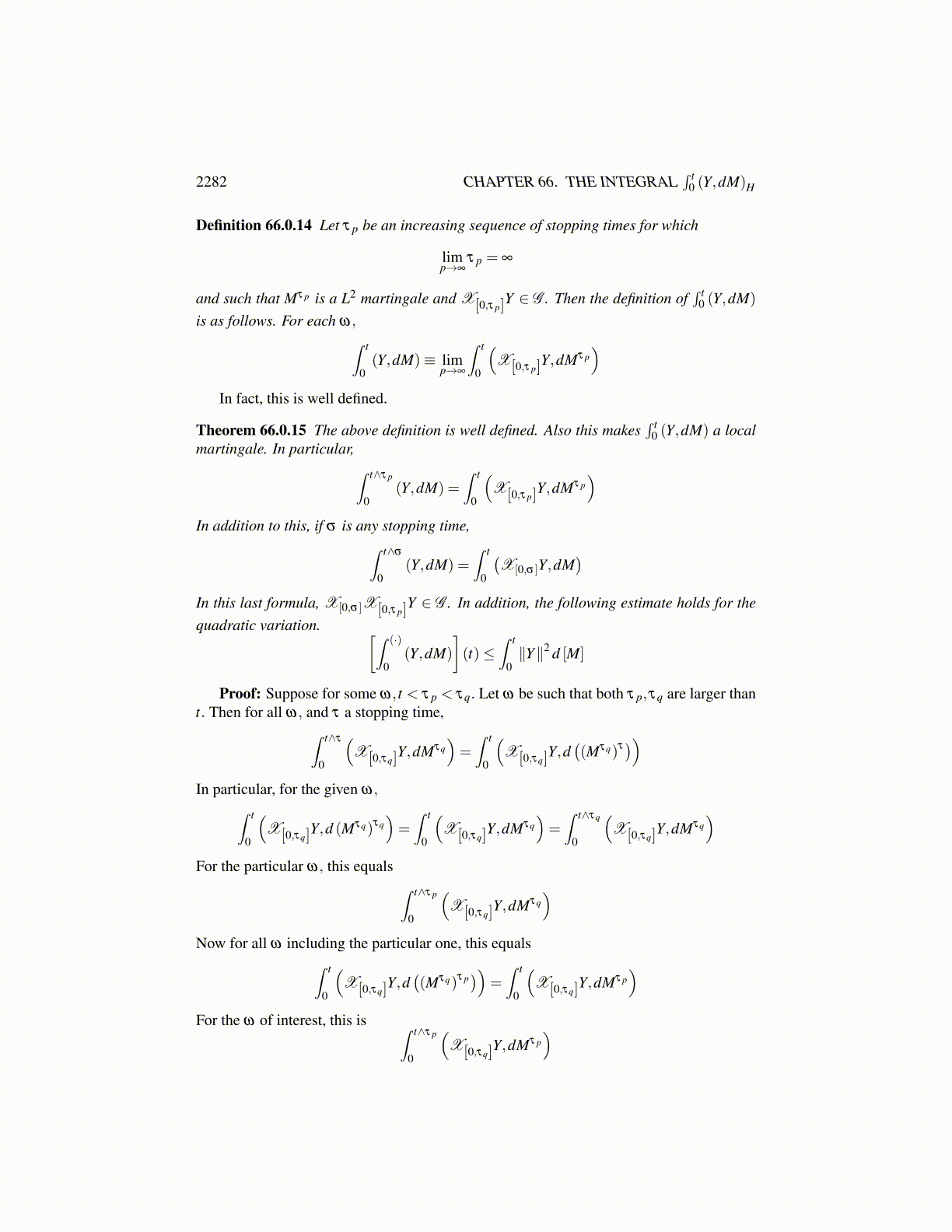 Therefore, in this case limk→∞ X[0,τk] (t) = X[0,τ] (t) . Next suppose X[0,τ] (t) = 0 so thatτ (ω) < t. Since the intervals defined by the partition points have lengths which convergeto 0, it follows that for all k large enough, τk (ω)< t also and so X[0,τk] (t) = 0. Therefore,