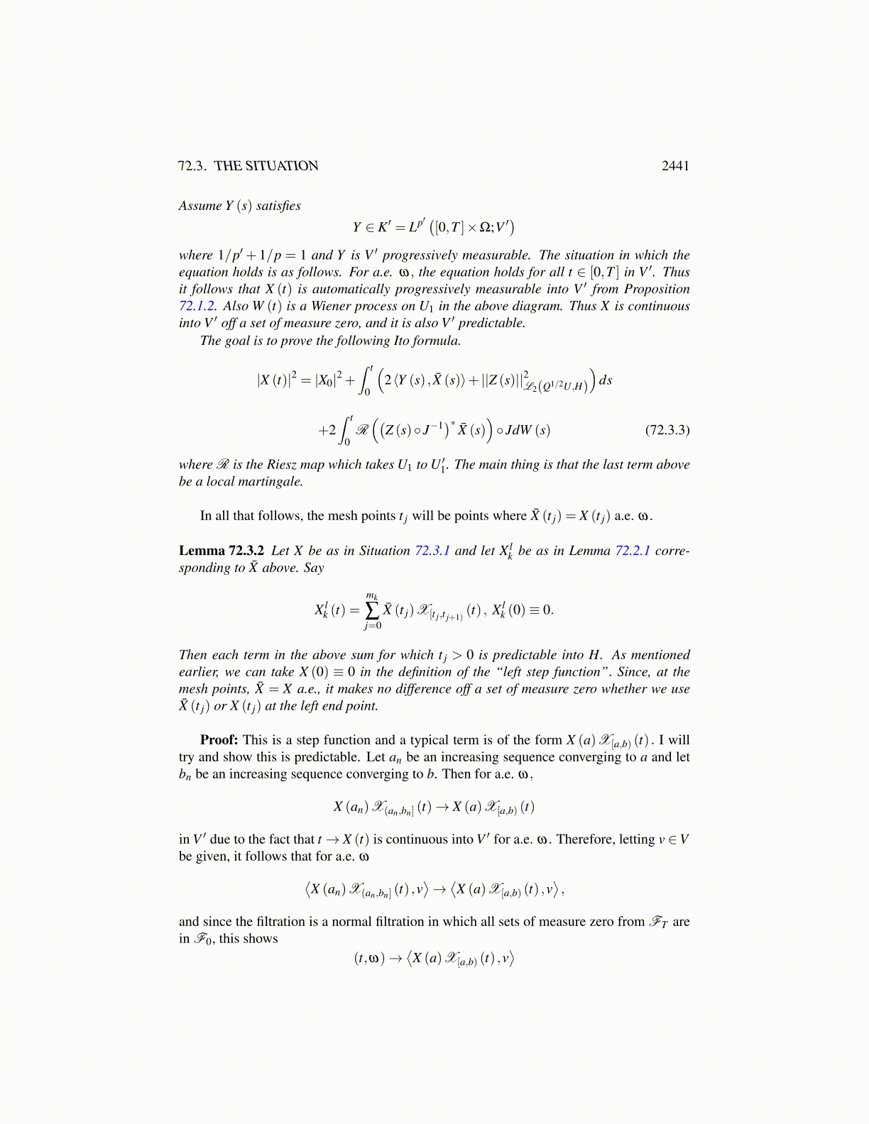 72.2 Approximating With Step FunctionsThis Ito formula seems to be the fundamental idea which allows one to obtain solutions tostochastic partial differential equations using a variational point of view. I am followingthe treatment found in [108]. The following lemma is fundamental to the presentation. Itapproximates a function with a sequence of two step functions X r