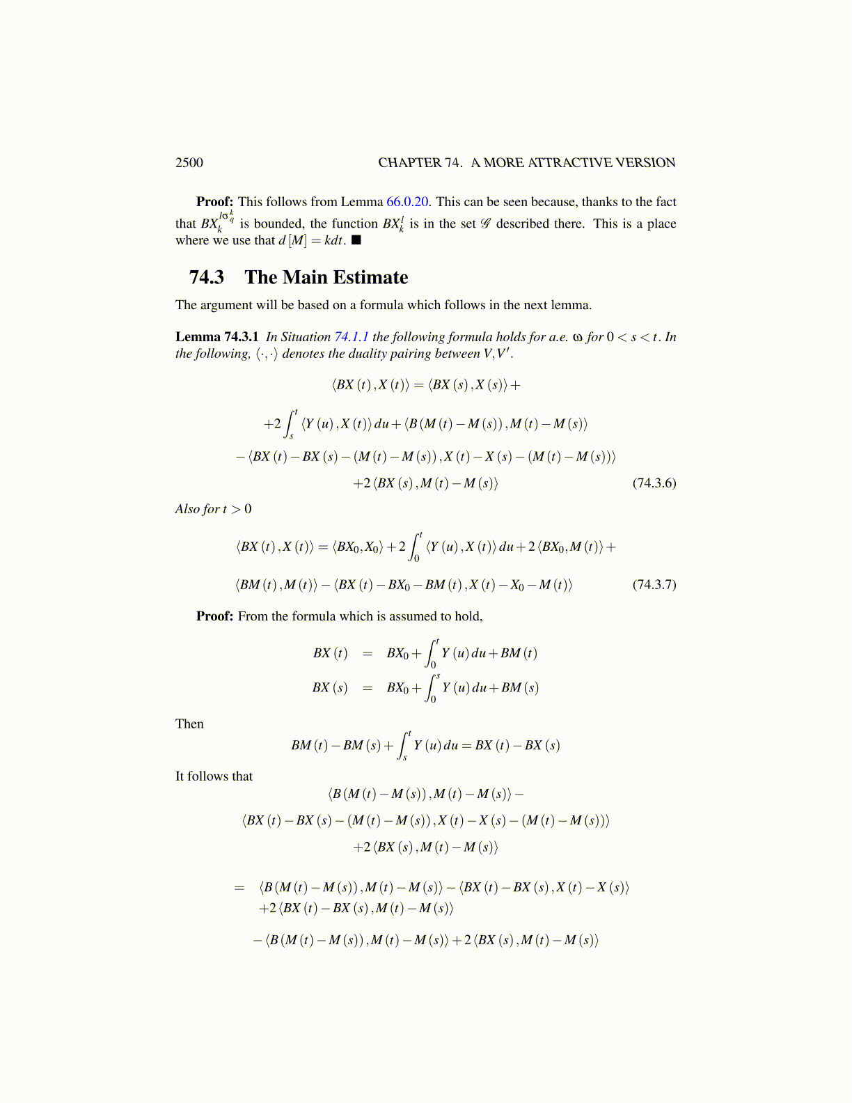 Lemma 74.2.1 In the above situation, there exists a set of measure zero N ⊆ Ω and adense subset of [0,T ] , D such that for ω /∈ N, BX (t,ω) = B(X (t,ω)) for all t ∈ D. This