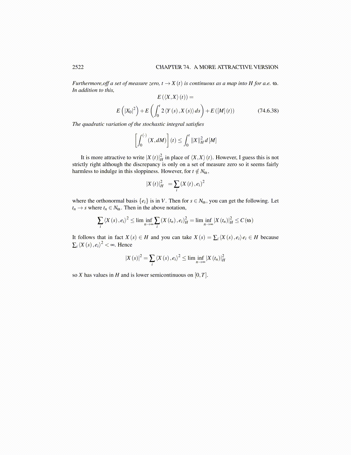 Then in short, ⟨BX ,X⟩(t) equals the right side of 74.6.34 for all t ∈ [0,T ] and is conse-quently progressively measurable and continuous. Furthermore, for a.e. t, this functionequals ⟨B(X (t)) ,X (t)⟩. Since it is known on a dense subset, it must be unique.