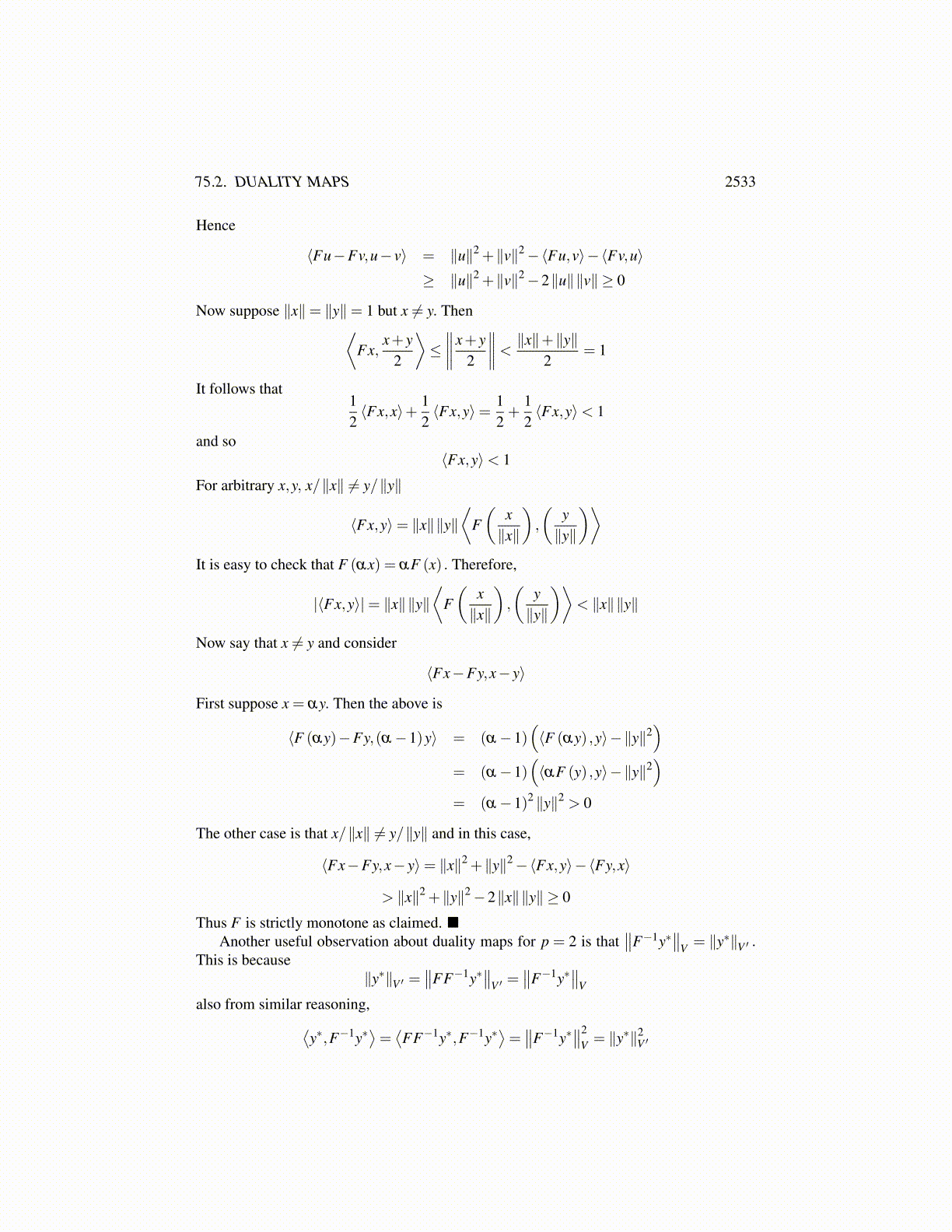 Theorem 75.2.3 Let X be a reflexive Banach space with X ′ having strictly convex norm1.Then for p > 1, there exists a mapping F : X → X ′ which is bounded, monotone, hemi-continuous, coercive in the sense that lim|x|→∞ ⟨Fx,x⟩/ |x| = ∞, which also satisfies theinequalities