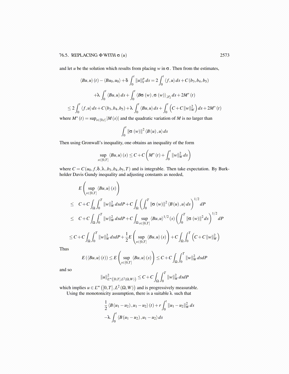 Now the same argument can be repeated for the succession of intervals mentioned above.However, you need to be careful that at T, you have Bu(T,ω) = B(u(T,ω)) for ω off aset of measure zero. If this is not so, you locate T ′ close to T for which it is so as inLemma 73.3.1 and use this T ′ instead, but these are mainly technical issues. This provesthe following existence and uniqueness theorem.