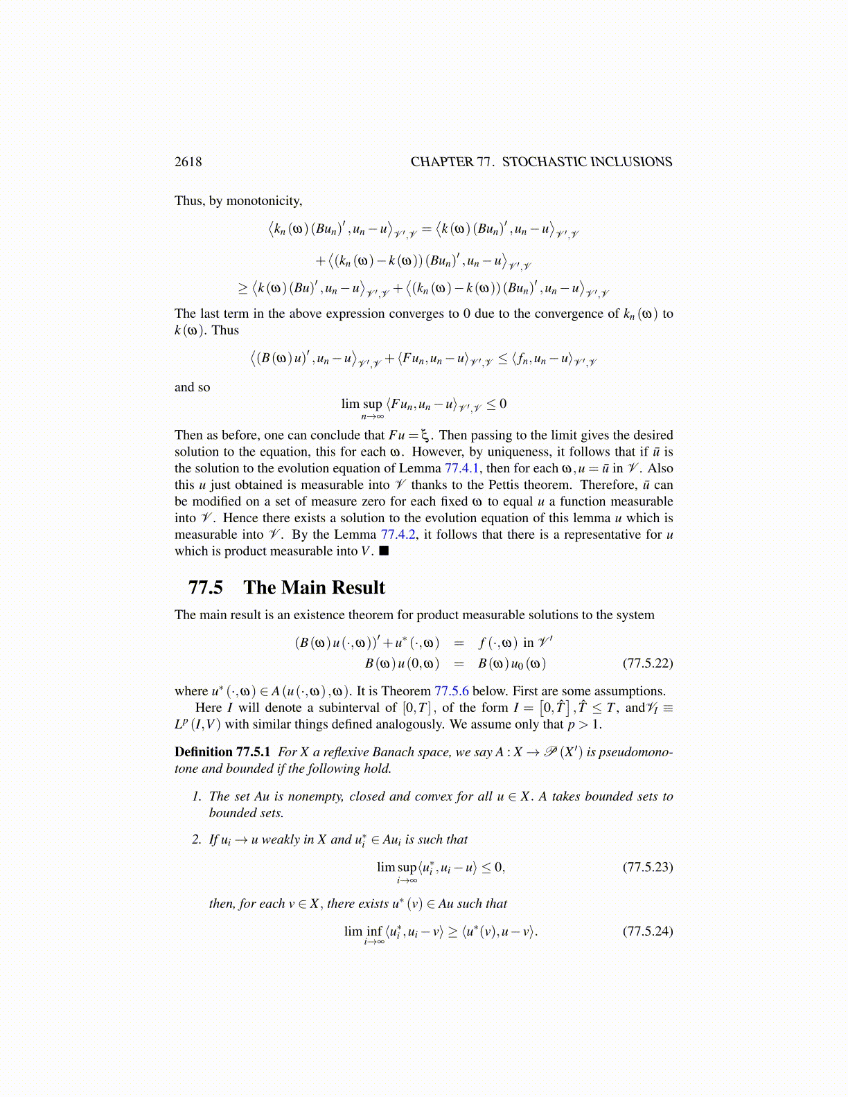 for U an open set in V ′×W . From Lemma 77.4.1, the map Φω which takes ( f ,u0) to thesolution u is demicontinuous. We desire to argue that u is measurable into V . In doing so,it is easiest to assume that B does not depend on ω . However, the dependence on ω can beincluded using the approximation assumption for B(ω) mentioned earlier.