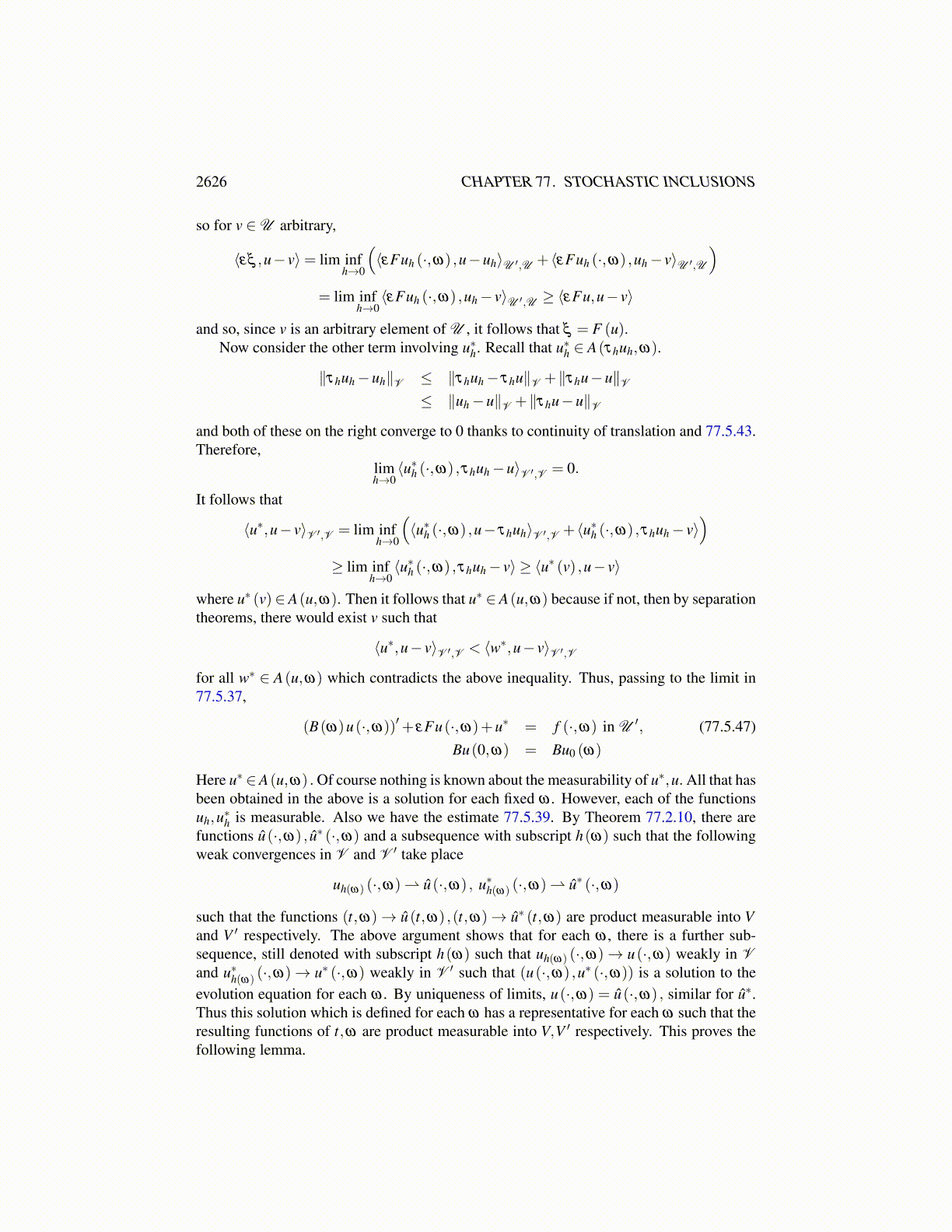 where u∗h ∈ A(τhu,ω) is a F measurable selection into V ′. Since F is monotone boundedand hemicontinuous, there is no problem with it being pseudomonotone from XrI to X ′rI .Such a solution exists on [0,h] by the above reasoning. Let this solution be denoted byu1. Then use it to define a solution to the evolution equation on [0,2h] called u2. Byuniqueness, these coincide on [0,h]. Then use u2 to extend to a solution on [0,3h] called u3.Then u3 = u2 on [0,2h]. Continue this way to obtain a solution valid on [0,T ]. By Lemma77.4.3, this solution may be assumed to be measurable into U ′. One gets this by using thelemma on a succession of intervals [0,h] , [0,2h] , and so forth.